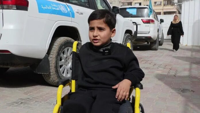 A child arrives at Al-Amal Hospital in his wheelchair in an attempt to get treatment.